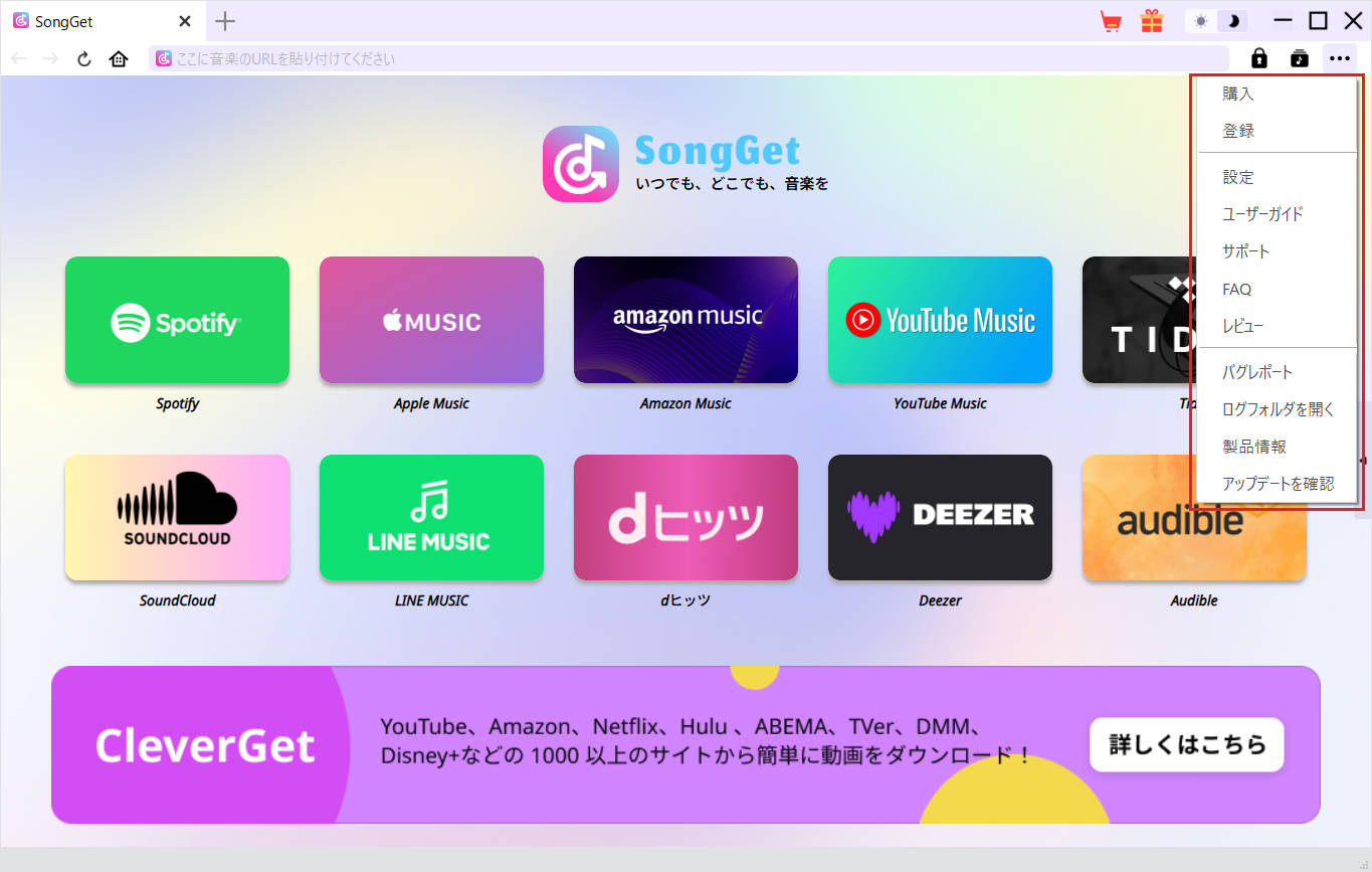 SongGet は、より快適な音楽ダウンロード体験を提供するために、ユーザーフレンドリーな設定を提供しています。SongGet の設定を表示および変更するには、右上にある「その他」アイコンをクリックします。ドロップダウンメニューには、今すぐ購入、登録、設定、ユーザーガイド、サポート、FAQ、レビュー、バグレポート、ログフォルダを開く、バージョン情報、アップデートなど、複数のオプションが表示されます。必要なヘルプを得るために、任意のオプションをクリックしてください。